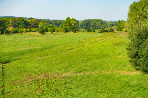 Obraz premium grüne Wiese im Vordergrund, Bäume im Hintergrund blauer Himmel