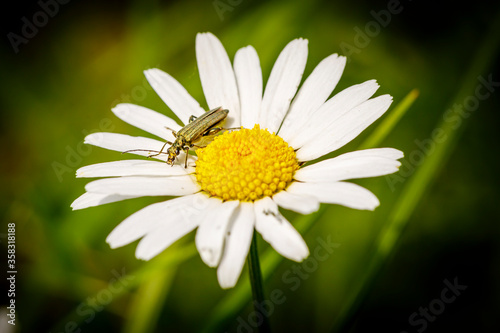 © Mr.Stock, Fototapeta premium Grüner Scheinbockkäfer sitzt auf einer Margeriten Blüte