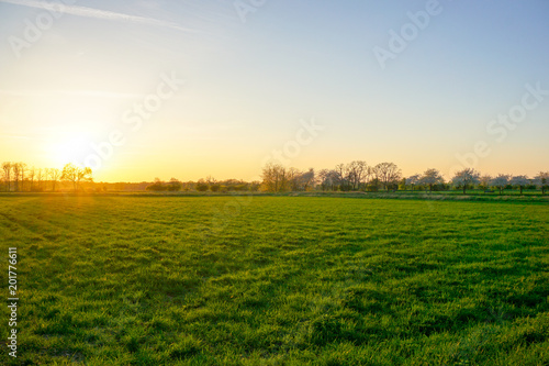 © luili, Fototapeta premium Grünes Feld Sonnenuntergang
