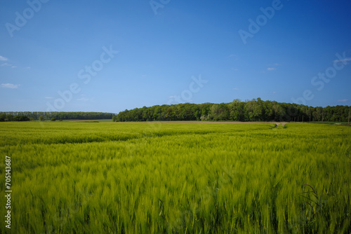 © AdKrieger, Fototapeta premium Grünes Getreidefeld vor Waldrand unter klarem blauem Himmel