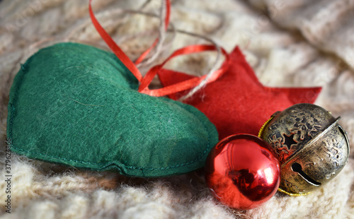 © EvaRuth, Naklejka premium Grünes Herz, Roter Stern, Christbaumkugel und Schelle als weihnachtliche Dekoration auf Schafwoll Pullover mit Zöpfen für Weihnachtskarte, Tischkarte, Geschenkanhänger