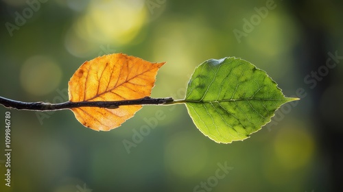 © Red Tiger Design, Obraz premium Grünes und gelbes Blatt auf einem Zweig
