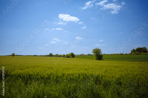 © AdKrieger, Obraz premium Grünes Weizenfeld unter blauem Himmel mit vereinzelten Bäumen im Frühling