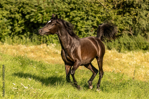 Fototapeta premium Graceful Arabian horse running freely on summer pasture