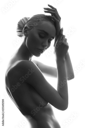 Fototapeta premium Graceful art Nude girl blonde erotic posing, clean smooth skin, thoughtful...
