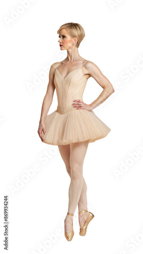 © DesignVectX, Naklejka premium Graceful ballerina in beige tutu performing on pointe shoes on a transparent background