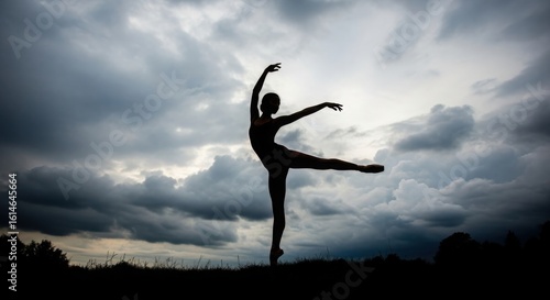 © FahimAbrar, Fototapeta premium Graceful ballerina performs a dynamic pose against a dramatic cloudy sky capturing the essence of movement and artistry silhouette