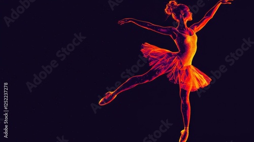 © pattaphorn, Obraz premium Graceful ballet dancer in vibrant orange and pink flow against dark background showcasing elegance and motion