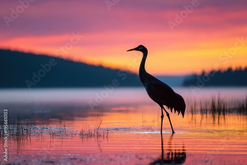 © Olena, Naklejka premium Graceful bird silhouette against a glowing sky over calm waters