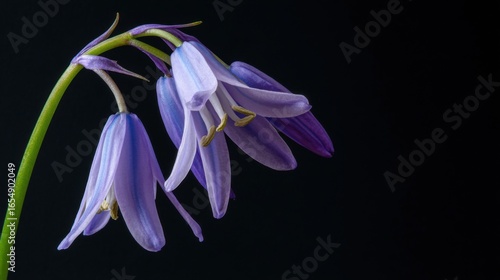 © EpicFade, Naklejka premium Graceful Bluebell Flower Bending Downward in Studio Shot Against Black Backdrop Showing Delicate Petals and Stamen with Green Stem