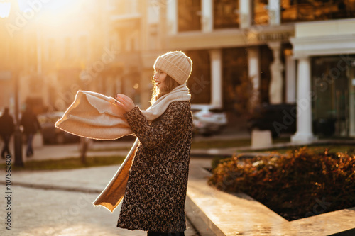 Obraz premium Graceful caucasian girl wears coat and scarf posing on the street. Merry...