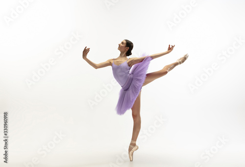 © master1305, Obraz premium Graceful classic ballerina dancing, posing isolated on white studio background. Bright purple tutu. The grace, artist, movement, action and motion concept. Looks weightless, flexible. Fashion, style.