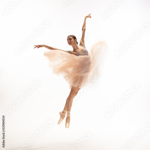 © master1305, Fototapeta premium Graceful classic ballerina dancing, posing isolated on white studio background. Tender peach cloth. The grace, artist, movement, action and motion concept. Looks weightless, flexible. Fashion, style.
