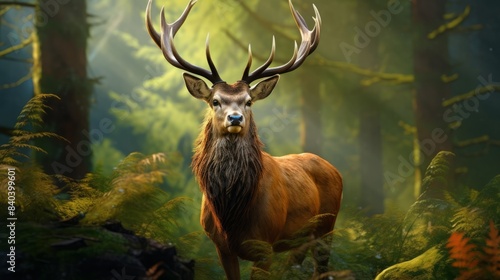 Fototapeta premium Graceful deer standing in a lush green forest, sunlight filtering through the trees, detailed fur and antlers.