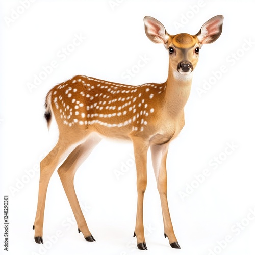 Naklejka premium Graceful deer with delicate brown spots stands isolated against a white background, evoking a sense of tranquility and natural beauty