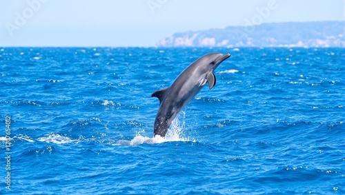 Fototapeta premium Graceful dolphin leaping in sparkling ocean coastline in background