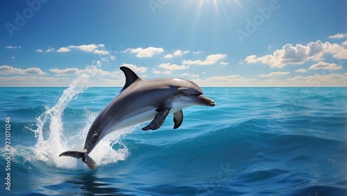 Fototapeta premium Graceful dolphin leaping out of the ocean, sparkling blue water under a clear,