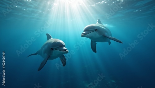 Fototapeta premium Graceful dolphins gliding under sunlit ocean surface