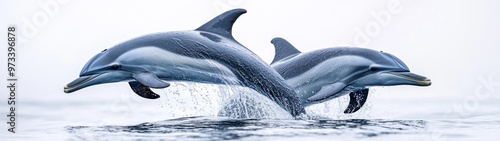 Fototapeta premium Graceful Dolphins in Motion, elegant dolphins gliding through azure waters, showcasing their streamlined bodies and playful nature, set against a serene, minimal backdrop.