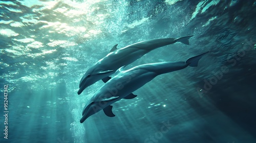 © pisan thailand, Fototapeta premium Graceful Dolphins Performing Synchronized Aquatic Ballet with Mesmerizing Underwater Cinematography