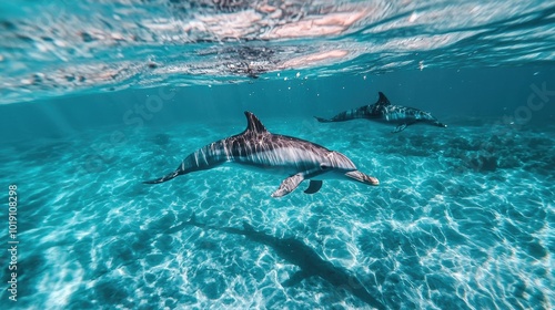 © Sampao, Obraz premium Graceful Dolphins Swimming in Clear Blue Water