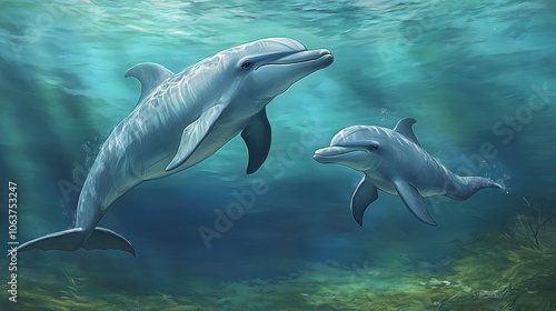 Fototapeta premium Graceful Dolphins Swimming in Clear Ocean Waters