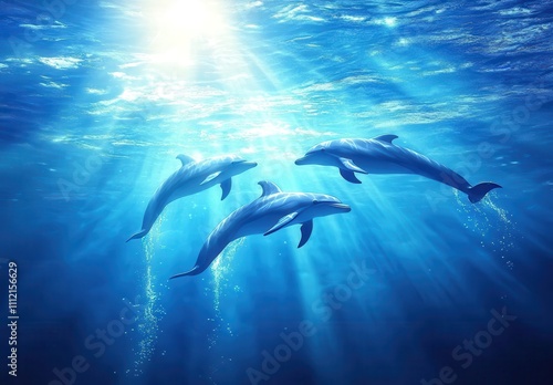 Fototapeta premium Graceful Dolphins Swimming in Crystal Clear Ocean Water with Sunlight...