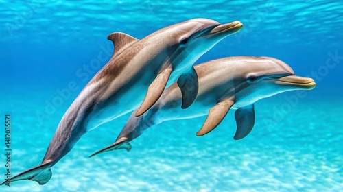 © Ratchanee, Obraz premium Graceful Dolphins Swimming Together in Clear Blue Ocean Water