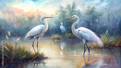 Fototapeta premium Graceful egrets wading in a marsh,digital, illustration, watercolor