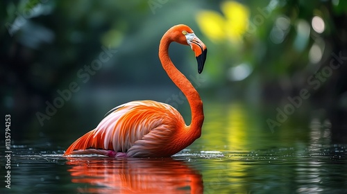 © Thares2020, Fototapeta premium Graceful Flamingo Posing in Tranquil Reflecting Waters Elegant Wildlife Portrait
