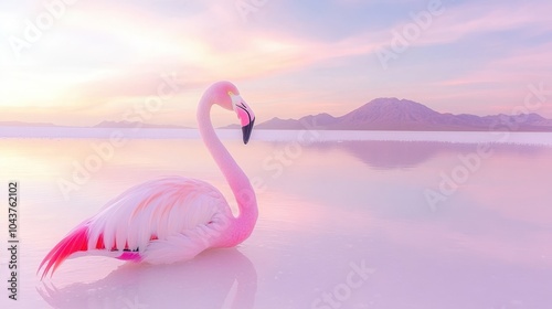 Naklejka premium Graceful flamingo wading in tranquil waters at sunset