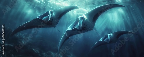© Coosh448, Fototapeta premium Graceful giant manta rays soaring through the water, 4K hyperrealistic photo