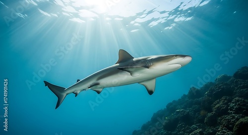 Fototapeta premium Graceful Gray Reef Shark Swims Near Coral Reef Under Sunlit Ocean Surface