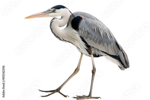 © EmBaSy, Obraz premium Graceful great blue heron stands solitary, grey feathers ruffled, long beak poised.