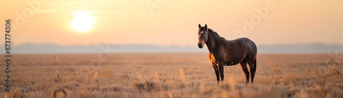 Fototapeta premium Graceful horse standing still in a golden field at sunset, Animal, Calm and...