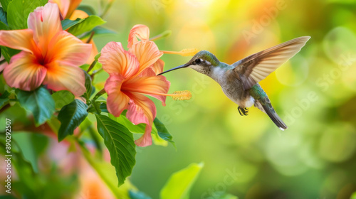 © poomrapee, Fototapeta premium “Graceful Hummingbird Hovering Near a Flower”