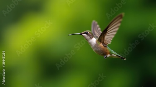 © Horizen, Naklejka premium Graceful hummingbird in mid-flight against blurred green backdrop
