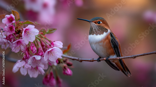 © Maksym, Naklejka premium Graceful hummingbird perched momentarily on thin branch near cascading pink blossoms, shimmering feathers catching rays of golden sunlight