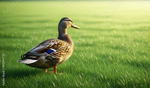 © random, Fototapeta premium Graceful mallard duck standing in vibrant green grass enjoying a sunny afternoon light