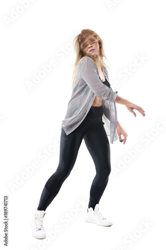 © sharplaninac, Obraz premium Graceful motion of young pretty woman dancing with flowing hair tousled over face. Full body length portrait isolated on white studio background.