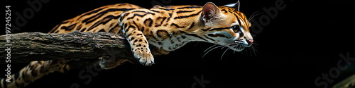 Obraz premium Graceful Ocelot: An ocelot, mid-leap, with a branch in its paws