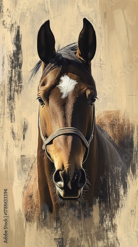 © Юджин, Fototapeta premium Graceful Pedigree Horse Portrait — Elegant Chocolate Stallion in Muted Pastel Colors