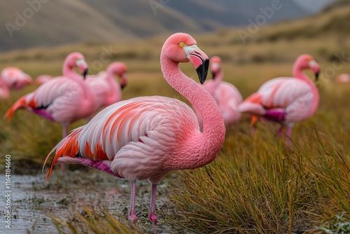 Fototapeta premium Graceful pink flamingo captured in a stunning close-up, highlighting its...