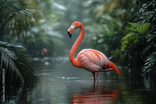 © Antonov, Fototapeta premium Graceful pink flamingo captured in a stunning close-up, highlighting its vibrant feathers, elegant curves, and serene beauty. A perfect representation of nature’s artistry.