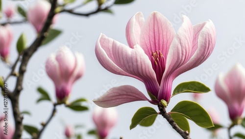 Fototapeta premium Graceful Pink Magnolia Bloom Against Soft Background in Natural Light Showcase of Delicate Petals and Green Leaves