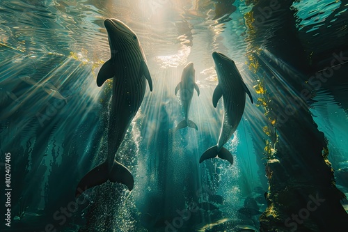 Fototapeta premium Graceful Pod: Dolphins Dancing in Aquarium Waters