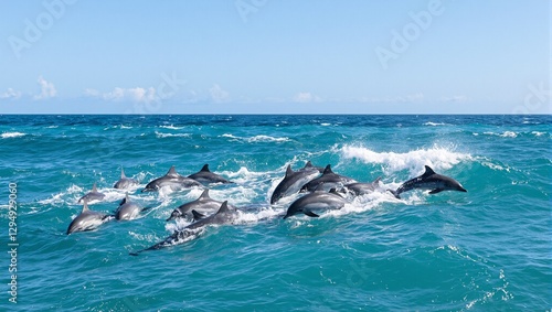Naklejka premium Graceful pod of dolphins playing in the sun dappled tropical waters their silvery bodies leaping in synchrony under the endless blue sky