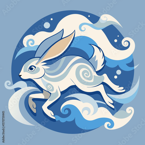 Fototapeta premium Graceful rabbit leaping amid swirling clouds, a whimsical graphic suitable...