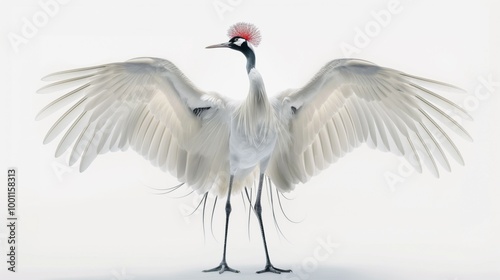 © Olga, Obraz premium Graceful red-crowned crane dancing with wings outstretched in elegant display. Isolated on white background