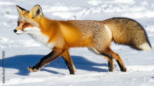 Obraz premium Graceful red fox exploring a snowy landscape, fluffy tail trailing behind in...